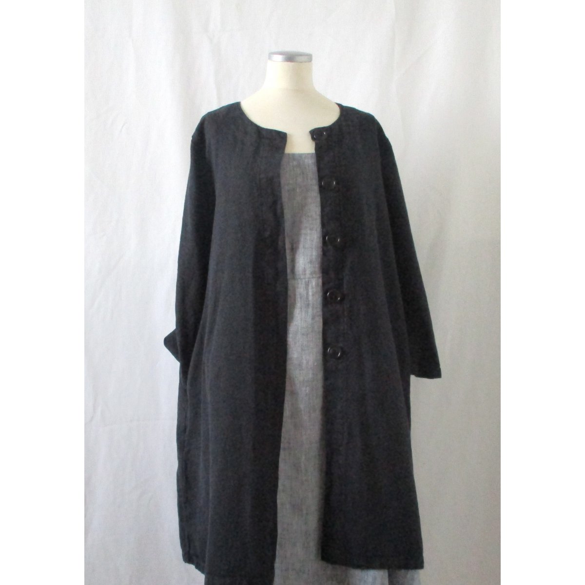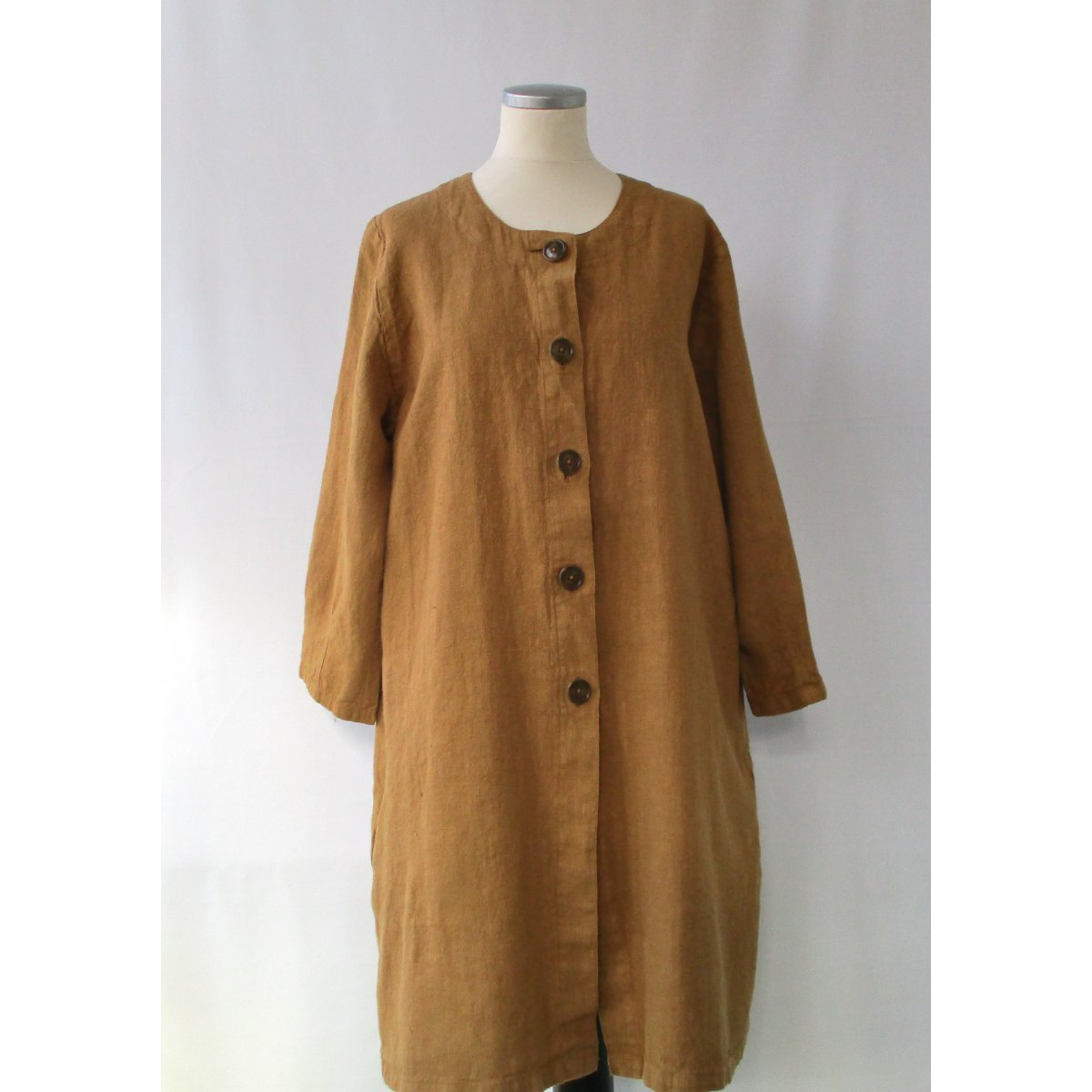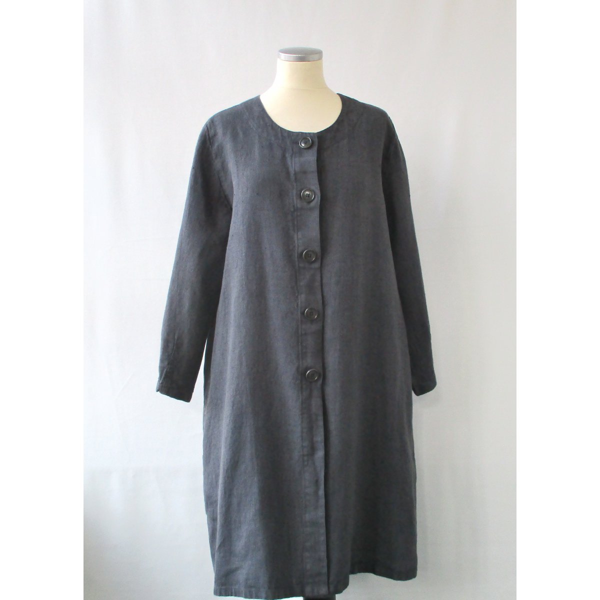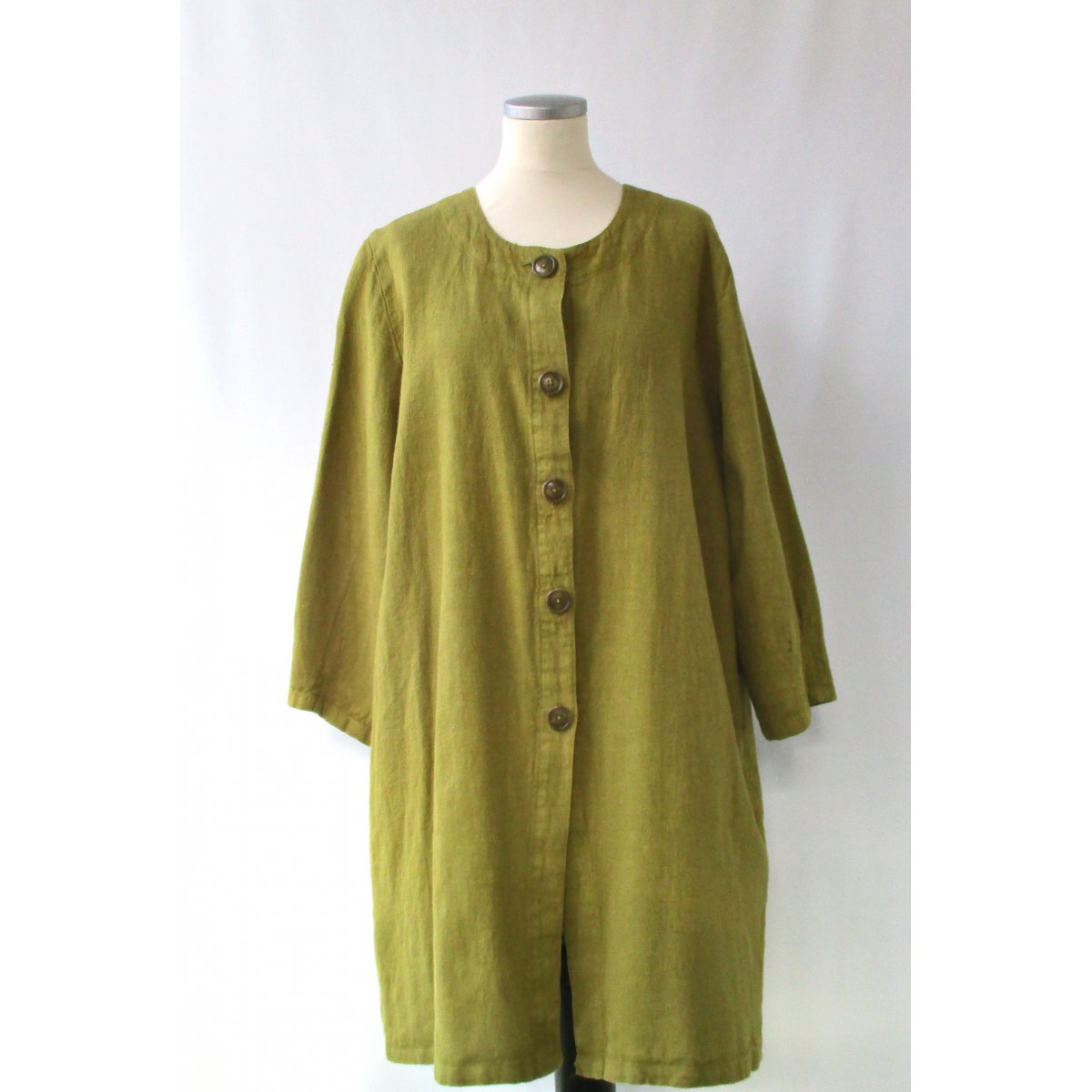Linnekappa alt. linnerock i A-modell. Knappar och härligt djupa fickor i sidsömmarna. Trekvartsärm som avslutas med sydda insnitt. Tvättad i 60 grader.
