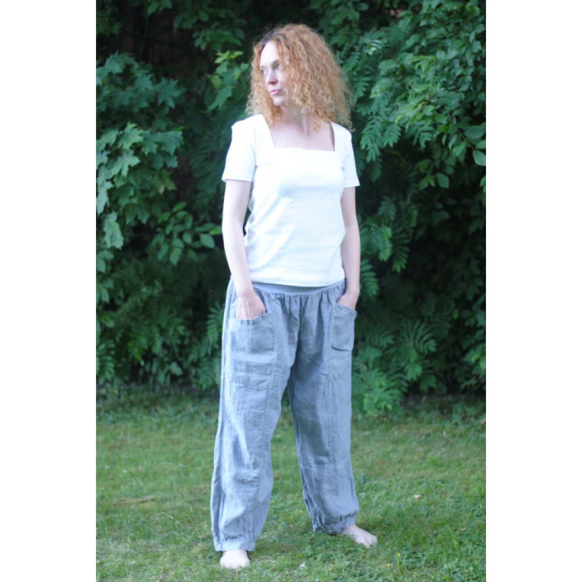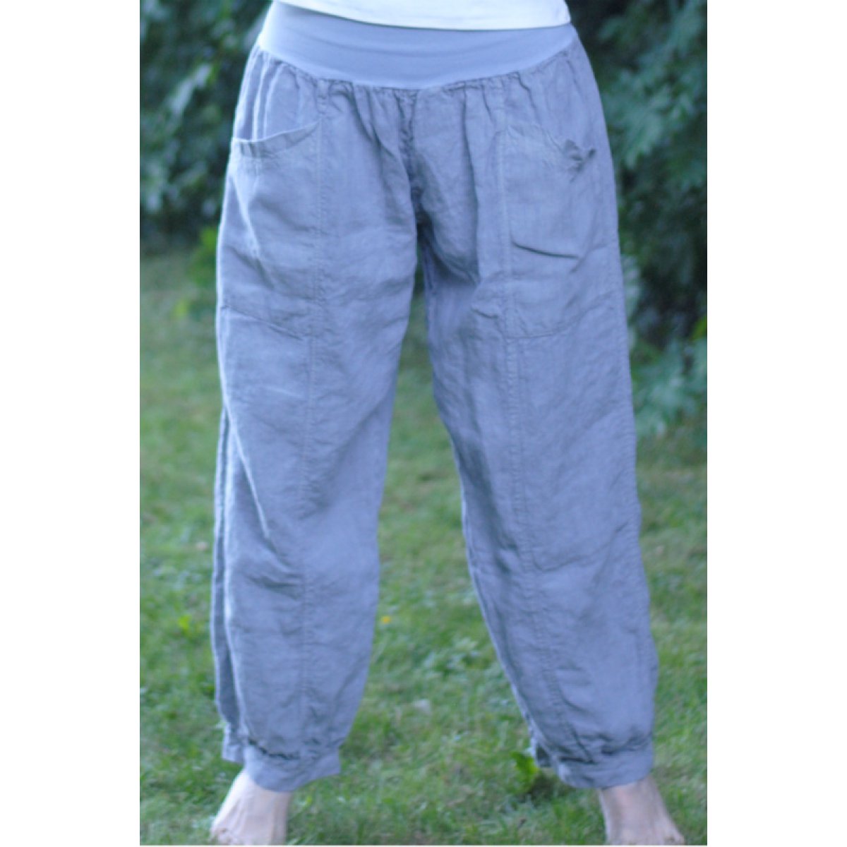 Byxor i tunnt linne, löst sittande med trikåmudd i midjan. Sköna allt i allo byxor.
