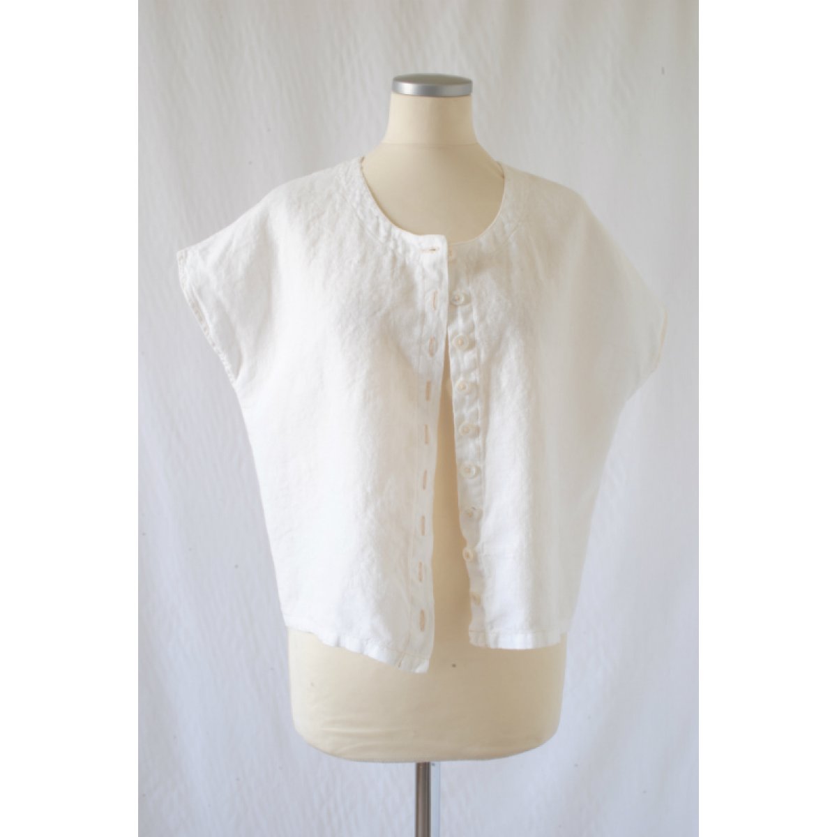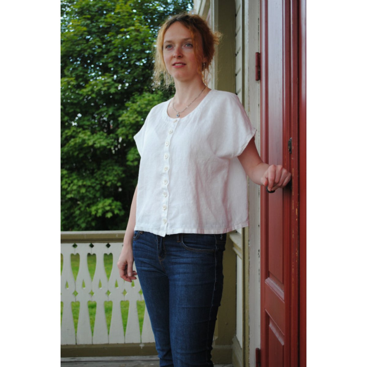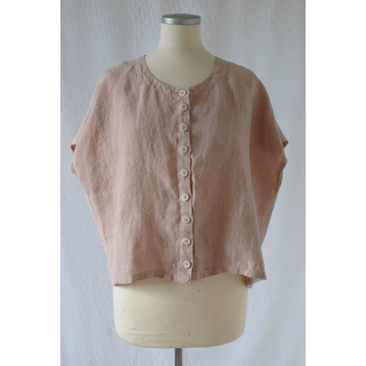 Lättburen linneblus med fina pärlemorknappar. Lätt att kombinera med andra plagg.