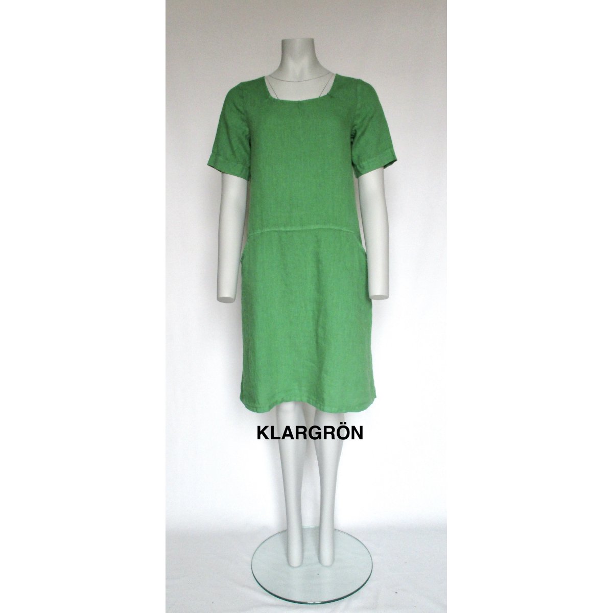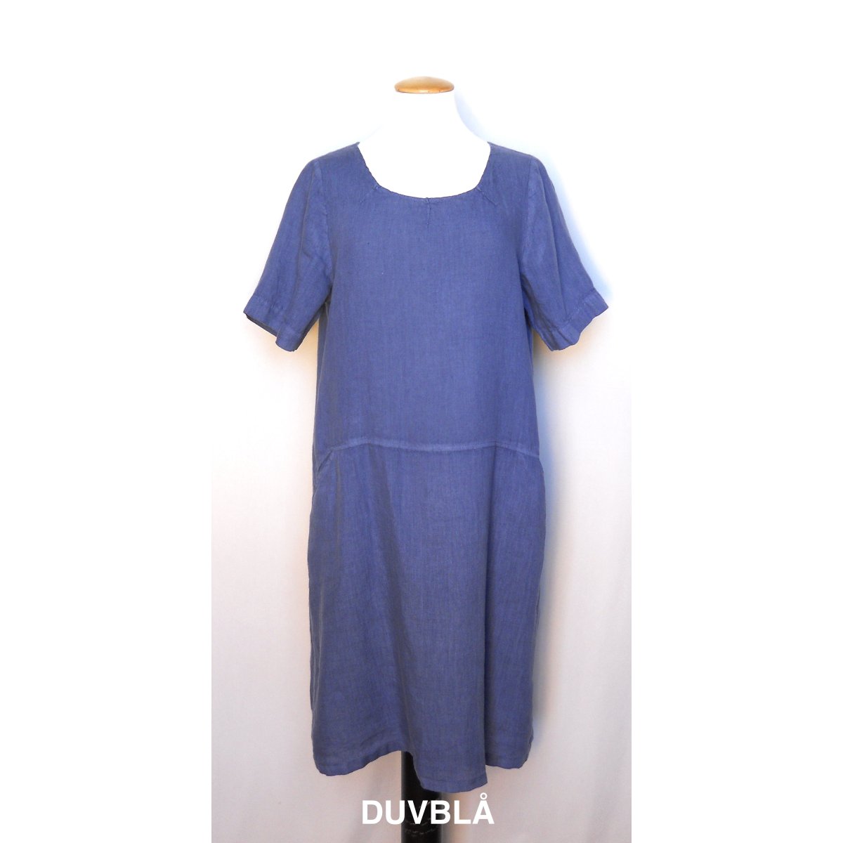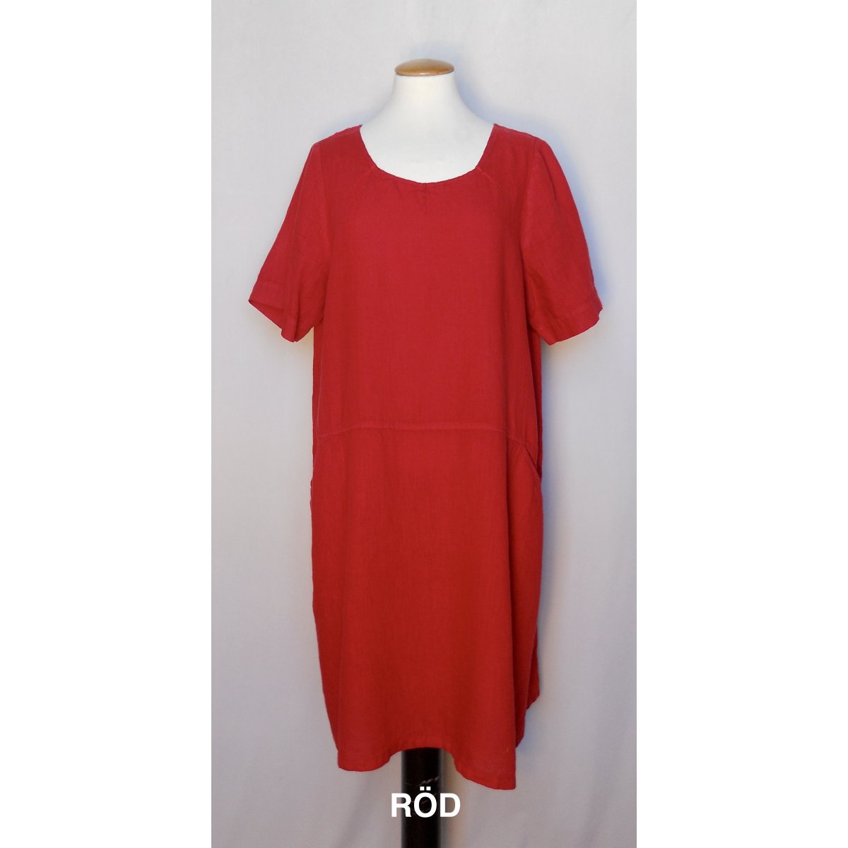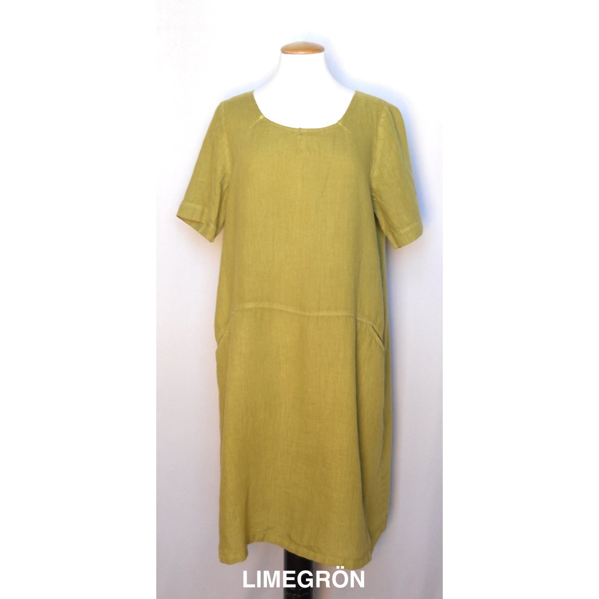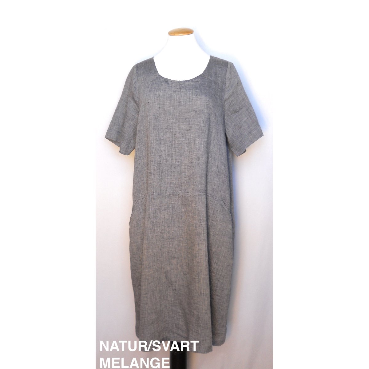 Generöst skuren klänning i tunnt linne. Fickor och sydda veck i halsringningen.