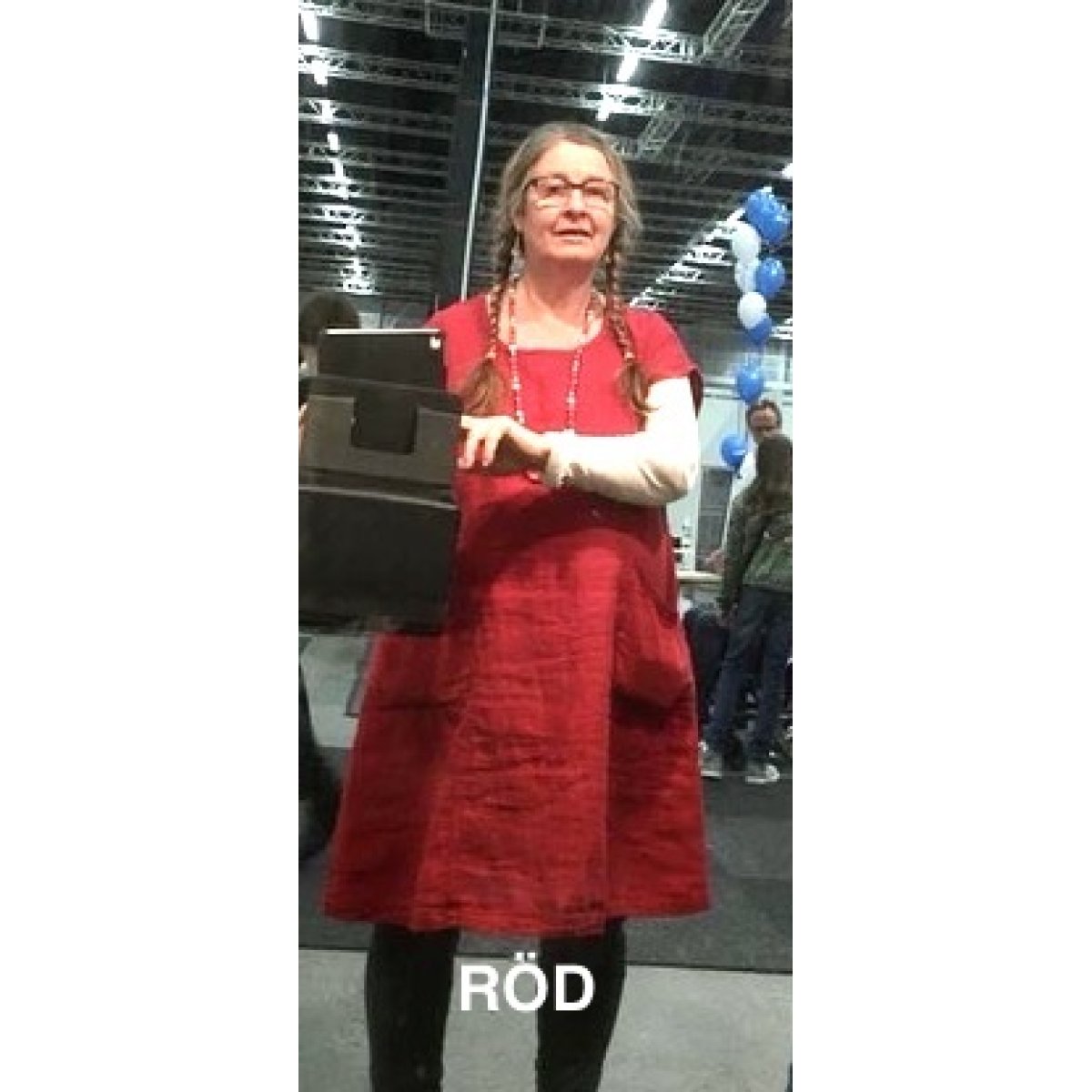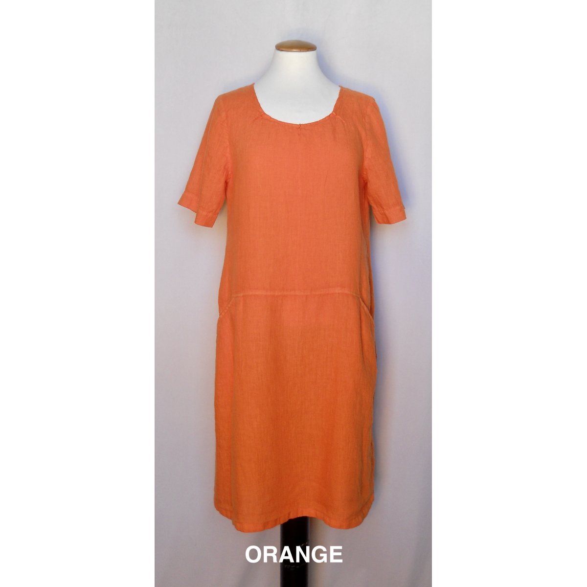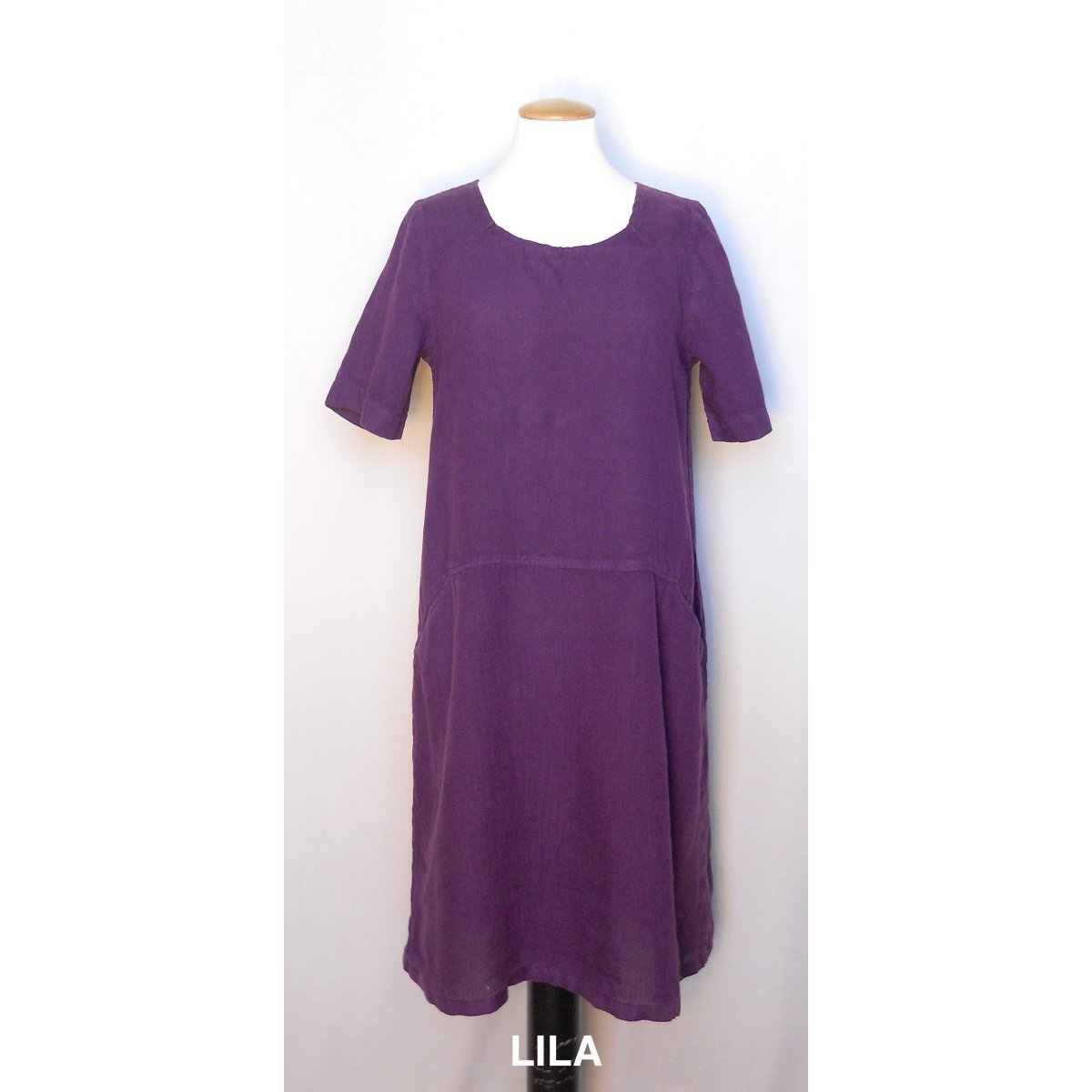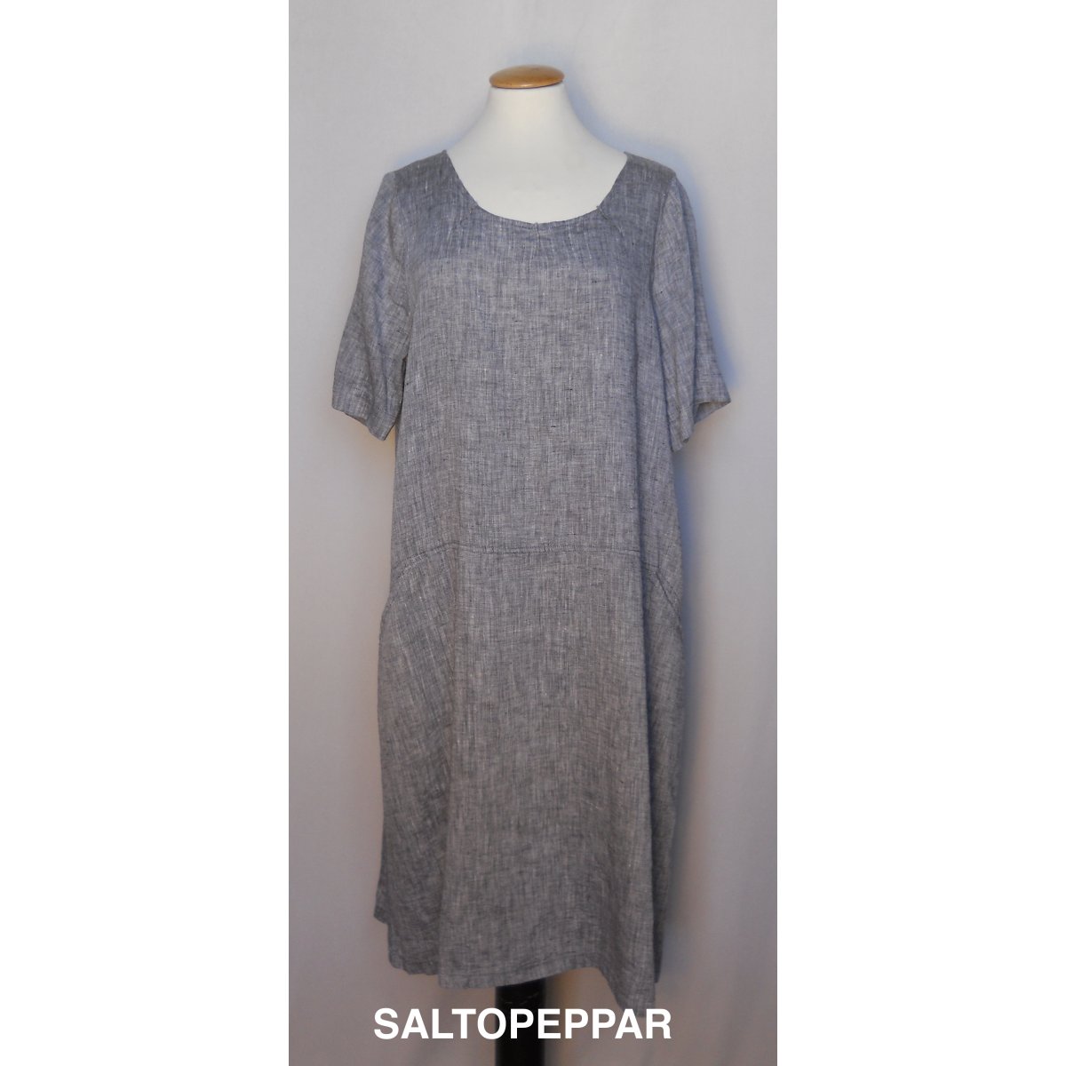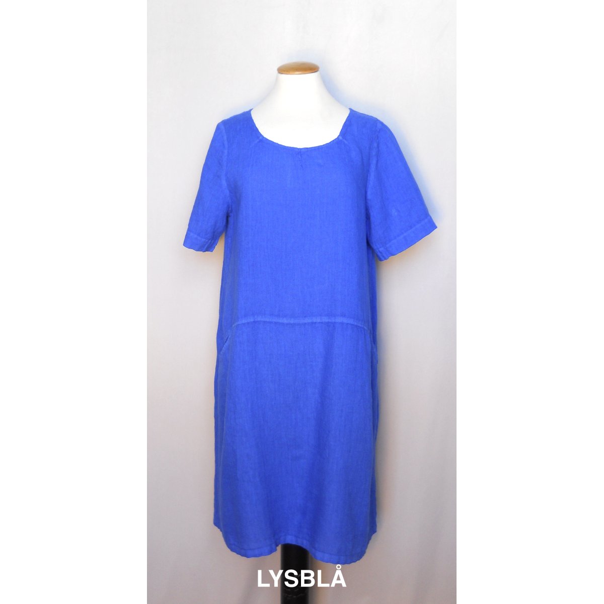 Generöst skuren klänning i tunnt linne. Fickor och sydda veck i halsringningen.